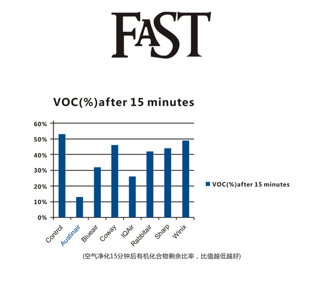 美國知名商業(yè)雜志《Fastcompany》聯(lián)合權威專家對多個知名品牌空氣凈化器進行了測評, 在《Buyer'sGuide: The best Air Purifier》(消費者指引:最佳空氣凈化器推薦)文章中向消費者推薦奧司汀空氣凈化器是去除氣味、甲醛、VOC等復雜化學氣體污染的最佳選擇。檢測中使用奧司汀健康伴侶標準型HM400與其它品牌在去除VOC(揮發(fā)性有機化學氣體)效率的PK中獲得完勝,15分鐘后VOC剩余率12%,遠低于其它品牌機型。