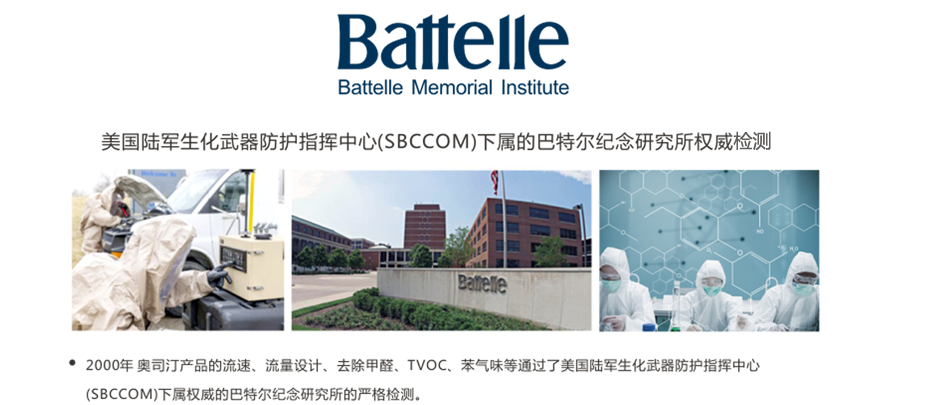 Battelle Memorial Institute紀念研究所)是總部設在美國俄亥俄州哥倫布市,在全球130個城市雇用了22000名科學家和研究人員,每年支配著高達65億美元的研發(fā)經(jīng)費巴特爾美國的獨立研究機構,巴特爾紀念研究所是以科學、教育和慈善為目的設立的機構,在美國享受免稅待遇。奧司汀空氣凈化器通過巴特爾紀念研究所嚴格檢測。